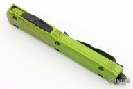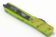 This Ultratech ZombieTech OTF Auto has a black double edged blade with fullers. Handle is toxic green anodized aluminum with custom random blood spatter pattern, and a black stainless steel tip up clip with integral glass breaker.  Has scuffs and scratches otherwise the knife is in good condition.