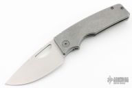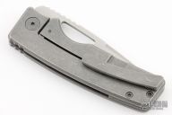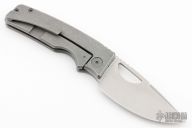 This knife by the OZ Machine Company features a tumbled 20CV blade with thumbhole and notched thumbrest. The handle features a smooth stonewashed titanium frame with a titanium backspacer and tip up pocket clip with hidden screws. Includes box and papers dated 12/7/23 and s/n 2672. Has some scuffs, otherwise excellent condition. Comes with extra green hardware.