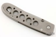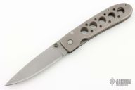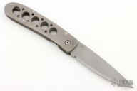 This Leopard Folder by Pat and Wes Crawford features a bead blast finished drop point blade with single thumbstud. The handle is comprised of a bead blasted titanium frame over a single titanium liner and steel backspacer. Has some scuffs and scratches, otherwise good condition.