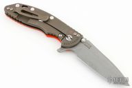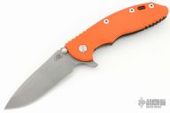 This XM-18 Flipper by Rick Hinderer Knives features a 3.5" working finished blade, notched thumbrest and flipper, dual thumbstuds. The handle has an orange G-10 scale, and a battle bronze titanium handle and satin finished hardware, and titanium clip. Clip can be mounted for tip up or down carry. Nice lockup, seating, and detent. Comes with original box and extra hardware. Has some scuffs, otherwise excellent condition.