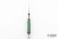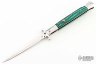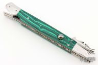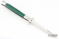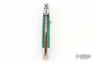 This Swing Guard by Mark Alan Anderson (Malan) features a polished spear point blade with swedge and fileworked spine. The handle comprised of a steel swing guard and bolsters/pommel with malachite scales over anodized titanium liners and fileworked backspacer. Some minor carry marks on bolsters, but overall great condition.