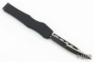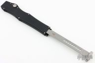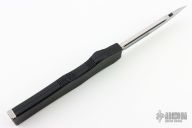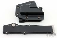 This Halo V OTF automatic from Marfione Custom Knives has a hand ground black ceramic coated blade with a standard edge, nightmare grind and a black aluminum handle. Comes with nylon zippered case, box, and Kydex sheath. Dated 03/2014 and has Marfione Dagger logo on charging handle. Knife has unique features in that it has a stainless steel button and charging handle (marked as such on the box). Has some light scuffs and scratches, excellent condition.