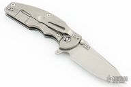 This Jurassic by Hinderer Knives features a stonewashed drop point blade with notched thumbrest and flipper. The handle has a stonewashed titanium frame with a black G-10 scale, tip up or down reversible clip and a modular backspacer. Nice detent, lockup and blade seating. This knife has the Tri-Way pivot system. Comes with original box and extra hardware. Excellent condition.
