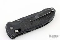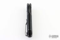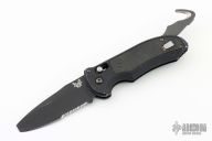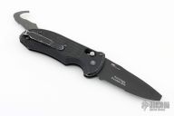 This Auto Triage Side Opening Axis Lock Auto has a black finished N680 drop point/ blunt tipped blade, as well as an auto opening 440C steel hook - both with safetys. Handle is black anodized aluminum with black G10 inlays, carbide glass breaker at butt, and black finished stainless steel tip up clip. Excellent condition. Has scuffs and scratches. This knife would make a great user.