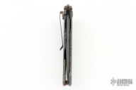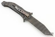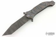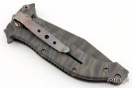This AXD assisted opening framelock flipper by Darrel Ralph features a black tiger stripped tanto blade with notched flipper. The handle has a flame finished titanium frame with bronzed tip down stainless steel clip. Nice lockup, action and blade seating. Has some light scuffs and scratches, great condition otherwise.