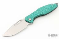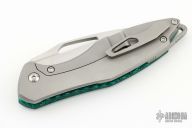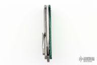 This Mini Arius by Koenig knives features a Brightwashed w/ PF finished blade with thumbhole. The handle has a smooth green twill and bead blasted titanium frame with a titanium tip up clip, titanium backspacer. Has ceramic bearings and a ceramic detent ball. Nice detent, lockup and blade seating. Comes with original box and COA December 27, 2023. Excellent condition.