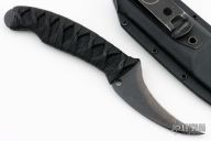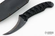 This Elvia by Tracker Dan features a black hawkbill blade with epoxied black cord wrapped handle, .118" blade stock and .955" blade depth, full tang construction. Comes with an kydex sheath with metal clip, the knife can go in either direction. Excellent condition.