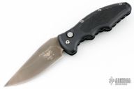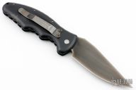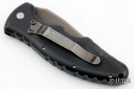 This is an ATKO 8 side opening auto with black aluminum handle, leather and rubber inserts, black tip down stainless steel clip. Black blade. Finger grips and notching around handle for sure grip. Has a few light scuffs, otherwise excellent condition.
