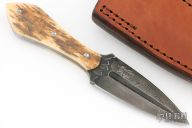 This Dagger by Jodi Muller features a double edged Damascus (1095 and L6) blade with fullers, .146" blade stock and 1.028" blade depth, full tang construction. The handle has mammoth ivory scales. Comes with a hand tooled brown leather wallet sheath. Excellent condition.