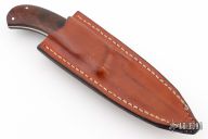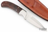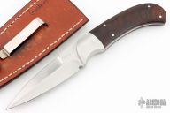 This fixed blade from Ron Gaston features a hand rub satin finished drop point blade. 0.178" blade stock and 1.004" blade depth, full tapered tang construction. The handle is comprised of satin finished stainless steel dovetail bolsters and ironwood scales with nickel silver pins. Includes leather sheath with belt clip. Has a couple of light scratches, otherwise excellent condition.