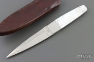 This boot dagger by Tommy Lee features a hand rub satin finish dagger shaped blade, satin finished stainless dovetailed bolsters and pearl scales with stainless pins, .133" blade stock and .941" blade depth, full tapered tang construction. Very nice work. Comes with a black leather sheath. Has a couple of very light scratches, otherwise excellent condition.