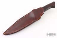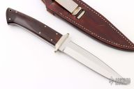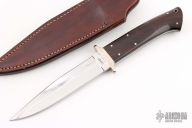 This knife by Harold Corby features a mirror polished clip point blade with .172" blade stock and 1.054" blade depth, sharpened rope edge, and full tapered tang construction. The handle has a nickel silver guard and pins, with wood. Comes with a brown leather sheath. Has some light scuffs and scratches, great condition otherwise.
