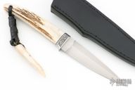 This Boot Dagger by Peter Del Raso features a hand rub satin finished double edged blade, .156" blade thickness and .978" blade depth, full tapered tang construction. The handle has engraved stainless bolsters, stag scales and black liners. Comes with black leather sheath with belt loop. Has a couple light scuffs, otherwise excellent condition.
