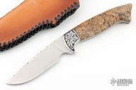 This Shasta by Dusty Moulton features a hand rub satin finished blade with fileworked thumbrest on spine, .151" blade stock and 1.123" blade depth, full tapered tang construction. The handle has engraved and dovetailed stainless steel bolsters, boxwood burl scales with black liners and mosaic pins. Comes with brown leather sheath with snakeskin panel. Engraving was done by the maker. Excellent condition.