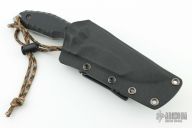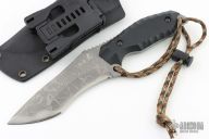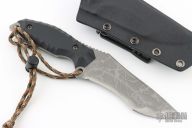 This backup special by Kiku Matsuda features an acid etched blade with notched thumbrest, .194" blade thickness and 1.65" blade depth, full tang construction. The handle has G-10 scales. Comes with kydex sheath. Excellent condition.