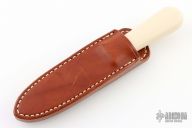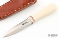 This Model 24 Guardian by Randall Made Knives features a satin finished double-edged blade with notched finger rests, .176" blade stock and .987" blade depth, hidden tang construction. Ivory linen micarta grip with black/duralumin spacers and a nickel silver guard. Both edges of the blade are sharpened with 1" of thumb notches. This model was designed in 1978 for use by police, undercover agents and law enforcement personnel for self-protection and as a back-up weapon. Comes with a brown leather sheath w/ boot clip. Has some light scratches, great condition otherwise.