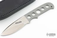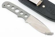 The Triathlete is a non-catalog knife by Randall Made Knives. It has a satin finished blade with notched thumbrest, .151" blade stock and .940" blade depth, integral construction. Notched thumbrest. Bead blast handle. Comes with black leather sheath with belt clip. Has a couple light scuffs, excellent condition otherwise.