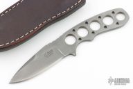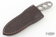 This knife features a drop point blade with a notched thumbrest, .155" blade stock and .966" blade depth, full tang skeletonized construction. Comes with a leather boot sheath with clip. Has scuffs and scratches, great condition otherwise.