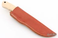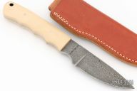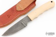 This Hunter by Charlton LTD features a drop point Damascus blade with .134" blade stock and 1.152" blade depth, full tang construction. The handle has ivory micarta scales with stainless steel pins. Comes with a hand brown leather sheath. Excellent condition.