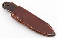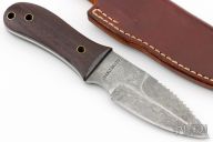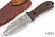 This Hunter by Charlton LTD features a drop point Damascus blade with serrated top edge, .134" blade stock and 1.244" blade depth, full tang construction. The handle has wood scales with brass pins. Comes with a hand brown leather sheath. Has some light scuffs and scratches, great condition otherwise.