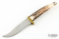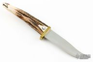 This knife by Ted Miller features a mirror polished blade with .085" blade stock and .822" blade depth, hidden tang construction. The handle has a brass guard and a carved stag grip with turquoise and jasper inlays. Comes with a stag stand, and zipper case. Has a couple light scuffs, otherwise excellent condition. #4209