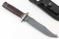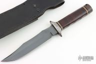 This S1 Bowie (Vietnam 5th Special Forces Group) has a black coated clip point blade with hidden tang and double guard. Blade width is just under 1/4", depth 1-1/4". Handle is contoured stacked leather with white spacers, black coated steel butt cap and lanyard hole. Comes with a black leather sheath. Very Rare. Blade is marked "SOG SPECIALTY KNIVES" on the presentation side. The non-presentation side has the Special Forces crest on the ricasso and "VIETNAM 5th Special Forces Group" on the swedge.  Comes with original sheath. Has some light scuffs and scratches, excellent condition otherwise.