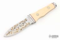 This is a very attractive boot knife from AG Russell. Blade is .134" thick at the ricasso and .848" deep at the ricasso and double-edged. Scales are ivory paper micarta with red liners. Integral construction with aluminum pins. Unusual piece. Has a few light scratches, otherwise excellent condition.