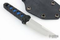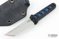 This Mini Tanto Neck Knife by Sam Eddleman features a mirror polished tanto blade with false top edge, .139" blade stock and .794" blade depth. Handle is wrapped in a traditional Japanese style using epoxy soaked nylon cord over rayskin. Comes in a custom black kydex neck sheath. Has some light scuffs and scratches, great condition otherwise.