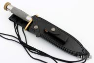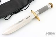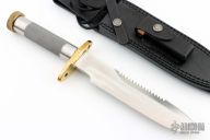 This Model 18-7.5 Attack Survival from Randall Made Knives has a spear point blade with sawteeth and sharpened top edge, .217" blade stock and 1.421" blade depth, hidden tang construction. The handle has a brass guard and knurled and butt cap with compass, knurled stainless steel handle. Comes with a black leather sheath and Randall zippered case. Excellent condition.