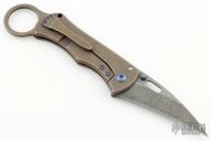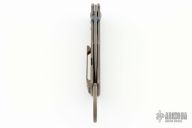 This Rostrum by John Gray features a black snow Magnacut blade with thumbstuds and thumbhole. The handle has a bark finished and anodized titanium frame with a ringed titanium backspacer and tip up titanium clip. Has a stainless steel lockface insert and overtravel stop. Nice detent, lockup and blade seating. New from maker at the 2024 Blade Show Texas.