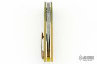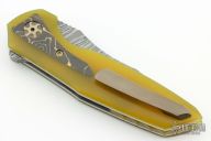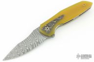 This Venture Linerlock Flipper by Peter Carey features a Mike Norris Fire Clone Damascus blade with notched thumbrest and flipper. The handle has lager G-10 scales with Fat Carbon Gold Camo Carbon inlay, anodized 3D milled titanium tip up clip, textured titanium liners, lager G-10 backspacer with dragon spine texture. Nice lockup, detent, and seating. Skiff Ceramic Bearings. Very smooth opening action. Comes with zippered case and COA. New from maker at the 2024 Blade Show Texas.