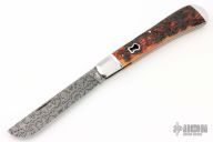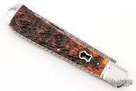 This Trapper by Chris Sharp features his Patented see-through escutcheon. The blade is Chris's own Damascus with a nail nick. The handle has polished 416ss fluted bolsters with integral liners and escutcheons, beautiful jigged bone covers, filework on liners and stainless steel spring. Has half-stop, flush in all positions. Comes with zippered case.  New from maker at the 2024 Blade Show Texas.