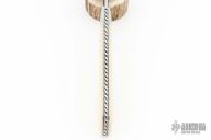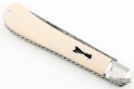 This Trapper by Chris Sharp features his Patented see-through escutcheon. The blade is Chris's own Damascus with a nail nick. The handle has polished 416ss fluted bolsters with integral liners and escutcheon, vintage ivory paper micarta covers, filework on liners and stainless steel spring. Has half-stop, flush in all positions. Comes with zippered case.  New from maker at the 2024 Blade Show Texas.