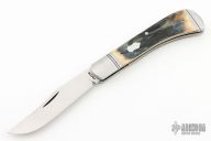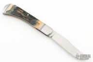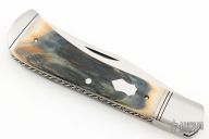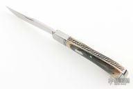 This Trapper by Phil Jacob features a hand rub satin finished blade with nail nick.  The handle has threaded stainless steel bolsters, mammoth ivory covers, stainless steel escutcheon, stainless steel liners with fileworked spines and spring with Roman Knot filework.  Has half-stop, flush in all positions. Comes with a zippered case. New from maker!