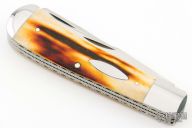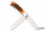 This Two-Blade Trapper by Bill Ruple features hand rub satin finished blades with nail nicks. The handle has mirror finished stainless steel bolsters, stag covers with fileworked stainless steel liners, stainless steel springs. Half stop blade positioning on both blades, flush in all positions. Excellent condition.  Comes with a zippered case.