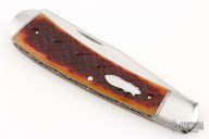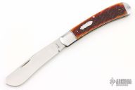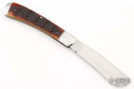 This Trapper slipjoint from Tanner Couch features satin finished bwith a nail nick.  The handle has threaded 416 stainless steel bolsters with fileworked 410 stainless steel liners with jeweled interiors, jigged bone covers with stainless steel escutcheon, fileworked stainless steel spring. The Half-stop is flush in all positions. Includes a padded zippered case and COA. New from maker at the 2024 Blade Show Texas.