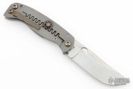 This F.M.P. (Farid Mehr Performance) framelock folder by Farid Knives features a Damascus blade with fuller and thumbhole. The handle has a Damascus and titanium frame with an anodized titanium clip and bronzed hardware. Nice detent, blade seating, and lockup. Has a stainless lockface insert and a titanium barrel spacer. Includes a padded zippered case.  Excellent Condition.