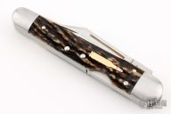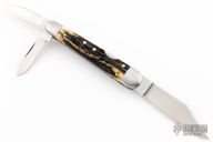 This Lockback Whittler by Tim Robertson features hand rub satin finished blades with nail nicks, the large blade is a lockback. The handle has stainless steel bolsters and liners with jeweled interiors, stag covers, three matieral bullet escutcheon, stainless steel spring. Has half-stop, flush in all positions. Comes with a zippered case. New from maker at the 2024 Blade Show Texas.