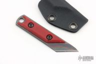 This Kiridashi by NCC Knives features a black chisel ground blade, .125" blade stock and .628" blade depth, full tang construction. The handle has a red G-10 scale with black screws and a lanyard hole. Comes with kydex sheath. Has scuffs and scratches, good condition otherwise.