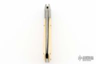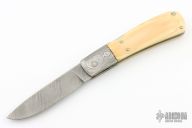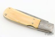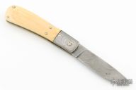 This front lock by PJ Tomes features a Damascus blade. The handle has pinched Damascus bolsters, bone covers, nickel silver liners, pins, and a stainless steel backspacer. Comes with a leather pouch. Has some light scuffs and scratches, great condition otherwise.