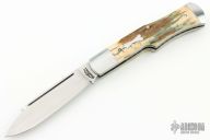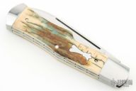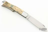 This Gunstock by Casey Berryhill features a hand rub satin finished blade with nail nick. The handle has satin finished stainless steel bolsters with integral liners that have jeweled interiors, mammoth ivory covers, stainless steel escutcheon and spring. Has half-stop, flush in all positions. New from maker at the 2024 Blade Show Texas. Comes with a zippered case.