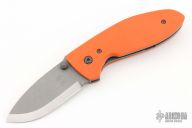 This Alpha framelock by Tom Krein features a stonewash secandi ground blade with dual thumbstuds.  The handle has orange G-10 scales, tumbled titanium liners and tip up clip, titanium backspacer. Nice lock up, detent and blade seating. Includes a padded case.   Excellent condition.