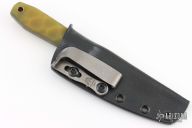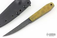 This knife by Jason Knight features a black stonewashed blade with false top edge, .198" blade stock and .704" blade depth, full tang construction. The handle has yellow translucent G-10 scales. Comes with a kydex sheath. New from maker.