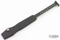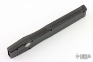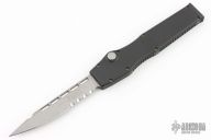 This HALO II is the clip point blade model in the HALO series by Microtech Knives. Single action, side positioned button for firing. Closure via a reverse charging handle in the rear of the frame. Contoured frame grip with milled ribbing on the frame spine and belly. This Halo II has a bead blasted clip point blade. Dated 03/98. Has some light scuffs, otherwise excellent condition. Comes with nylon belt sheath.