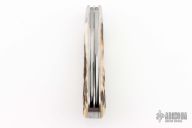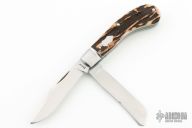 This Slipjoint by Jim Dunlap features a hand rub satin finished blades with nail nicks. The handle has fluted stainless steel bolsters, stag scales with stainless steel shield escutcheon, stainless steel liners and springs. Has half-stops, flush in all positions. Comes with a zippered case and COA. Excellent Condition.