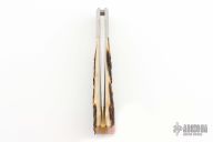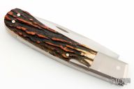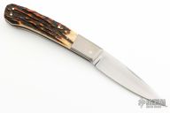 This Mid-Lock by W.D. Pease features a hand rub satin finished blade with nail nick and false top edge. The handle is comprised of titanium bolsters, stag scales, titanium liners and checkered titanium lockbar, stainless steel backspacer. Nice lockup and blade seating. Excellent condition. "osm14" on the blade.