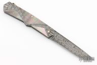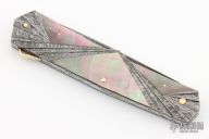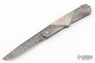 This Lockback by Ken Steigerwalt features a Damascus blade with fullers for nail nicks. The handle has a carved Damascus scales with black lip pearl inlays and gold pins, fileworked stainless steel liners, fileworked stainless steel backspacer with gold lock release. Excellent condition. Very classy little piece.