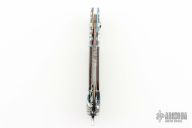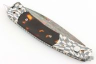 This Linerlock Auto by Frank Potter features a blued Eggerling Damascus blade. The Eggerling Damascus in Potters knives are strictly proprietary and not sold to any other knife makers. The handle has blued Eggerling Damascus bolsters, front and rear, tortoise scales, gold anodized and fileworked titanium screws, anodized and fileworked titanium liners, and a fileworked stainless steel backspacer. Nice action, lockup and blade seating. Excellent condition.
