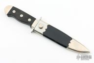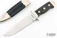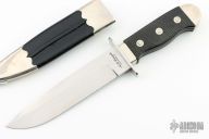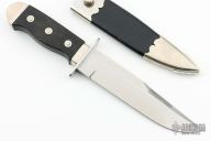 This "Henry Shively" style bowie by Alex Daniels features a hand rub satin finished blade with false top edge, .196" blade stock and 1.214" blade depth, hidden tang construction. The handle has a stainless steel guard, hand checkered ebony grip, nickel silver collar and butt. Comes with a black leather and nickel silver scabbard. Excellent condition.