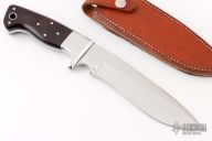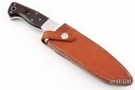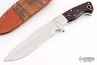This knife by WC Johnson features a mirror polish recurve blade with sharpened top edge, .253" blade thickness and 1.585" blade depth. Notched thumbrest. Full tang construction. The handle has mirror polished and dovetailed 303 Stainless Steel bolsters, and maroon linen micarta scales. Great feel in the hand. Very nice work. Comes with a brown leather sheath. Has a couple light scuffs and scratches, excellent condition otherwise.